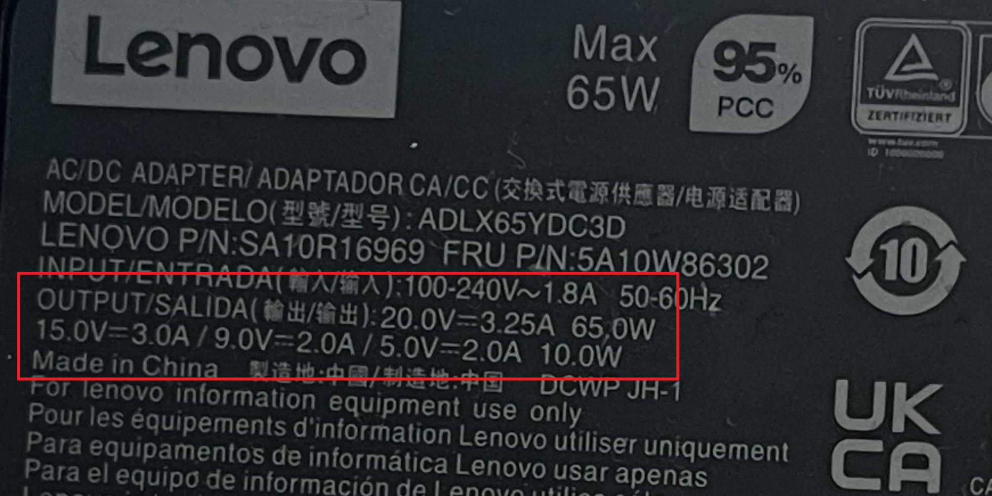 20.0V=3.25A 65.0W:这是该电源的最大输出规格,也是为联想T14笔记本供电、充电的核心档位,输出功率刚好65W,满足笔记本满负载运行+充电的需求。